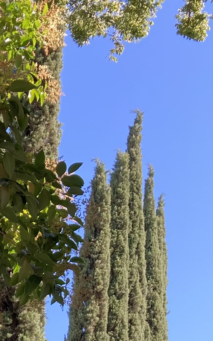 “No,” I said. “You’re thinking of Irish Yew. Yews are shorter and wider and have needles. Italian Cypress don’t have needles. They get pretty tall. They’re way taller than houses. In neighborhoods where there are not a lot of tall and branching trees, Italian Cypress really stand out, especially if it’s windy. When there’s a row of them with their tops blowing they do not get in each other’s way. You can watch each cypress drift in the wind or watch all of them at the same time.”