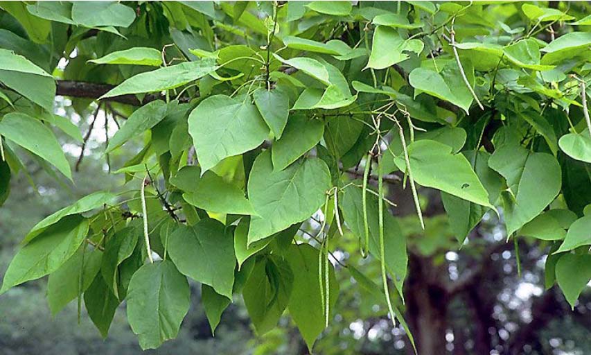 “They’re scattered around,” I said. “There’s one at the theater in William Land Park. If you’re sitting in the back look over to the right toward the beautiful garden. It’s on the other side of the pine tree. You can tell by their big heart shaped leaves and the long pods that get hard and brown in Autumn. In Spring they have white bell shaped flowers, but the flowers only last a month. You can easily miss them. You can’t miss the leaves or pods though, the way they hang and droop. Their hanging and droopiness fit our hot summer days.”